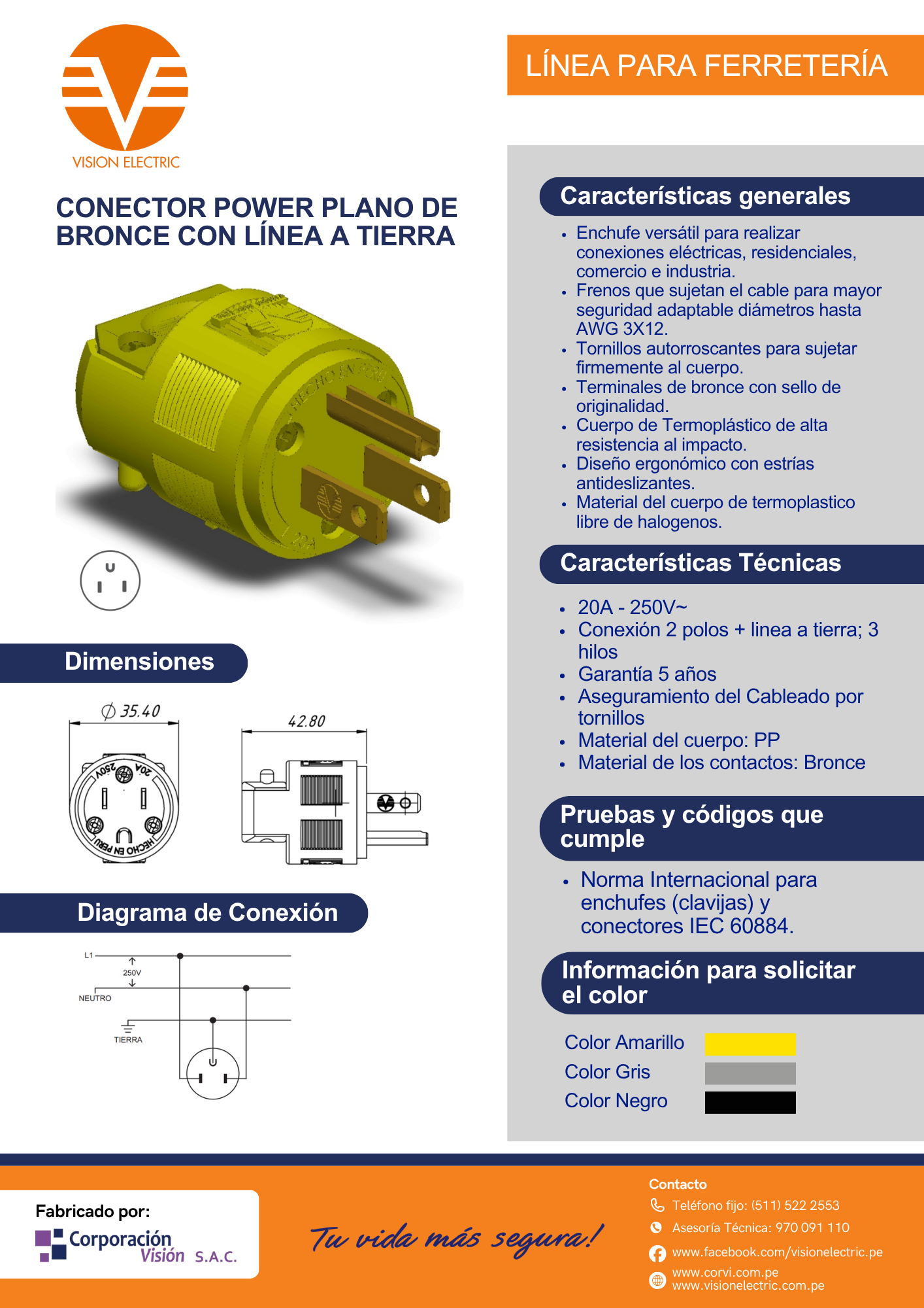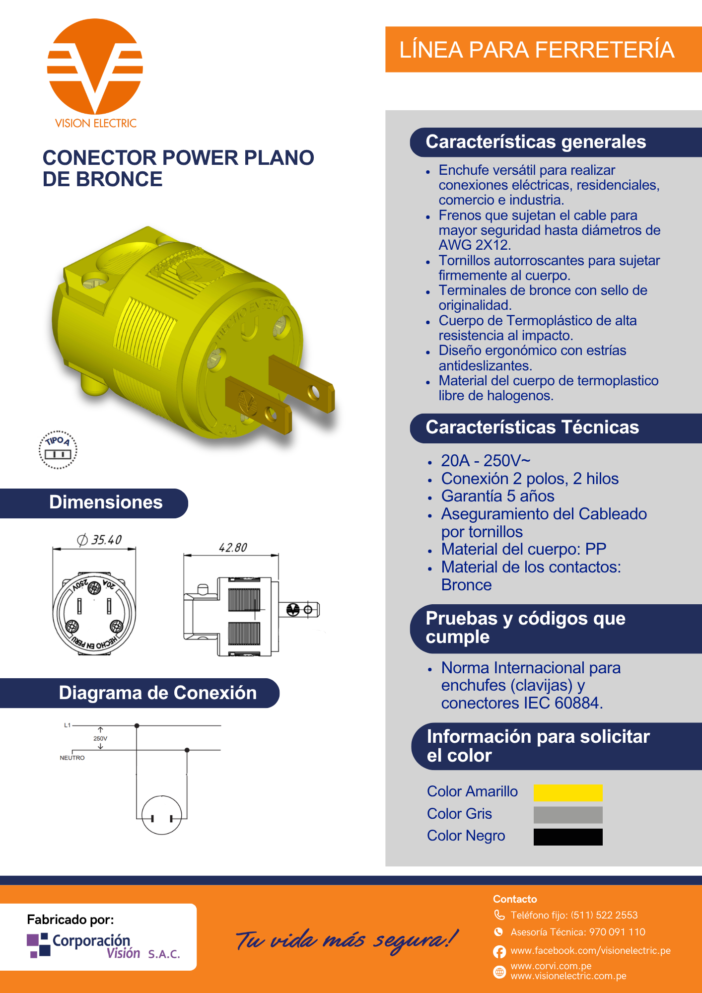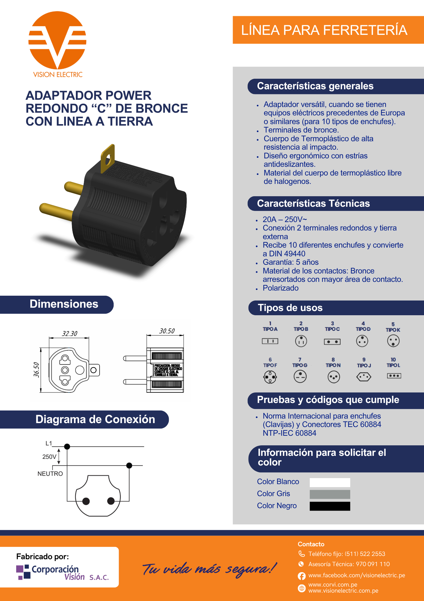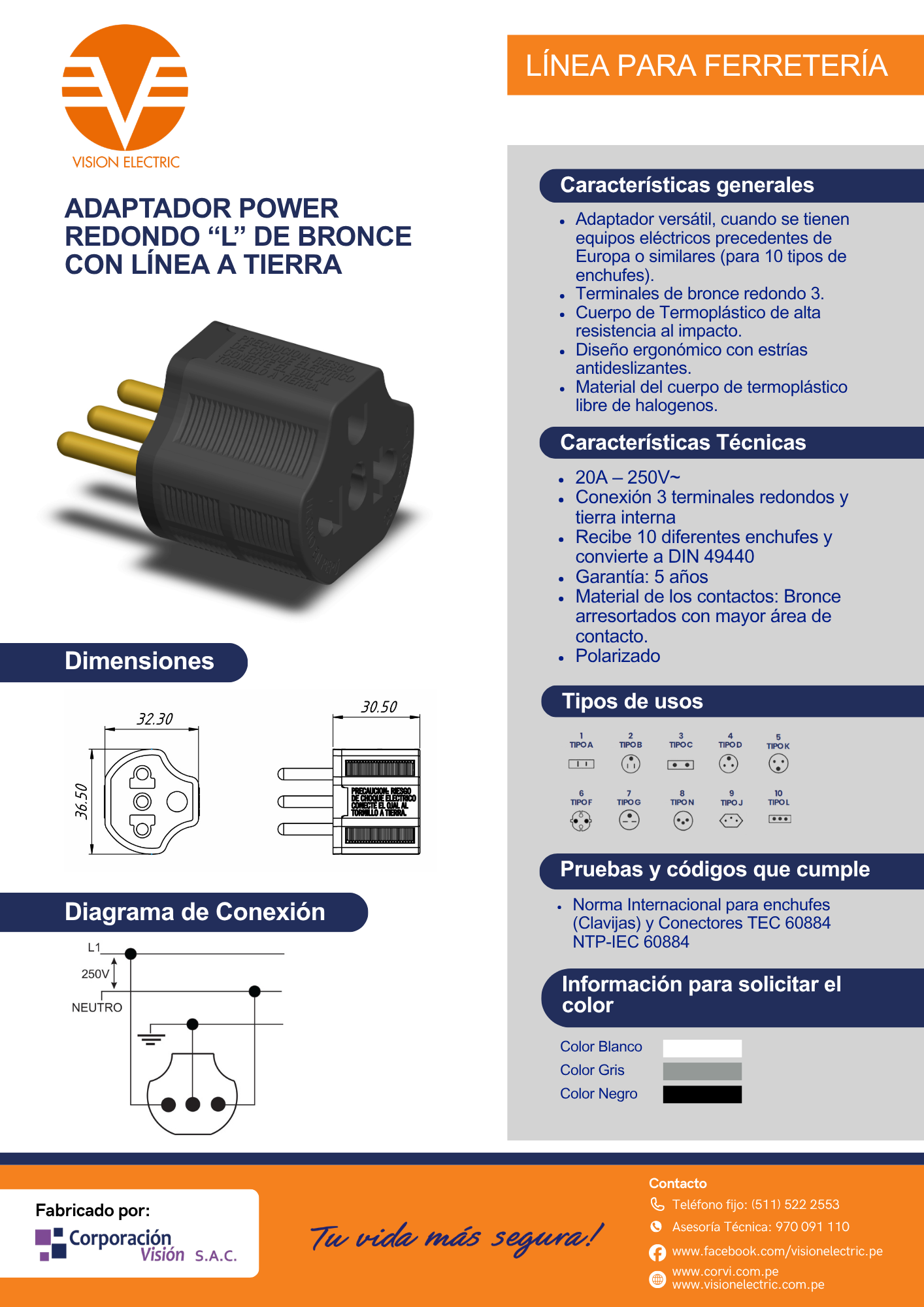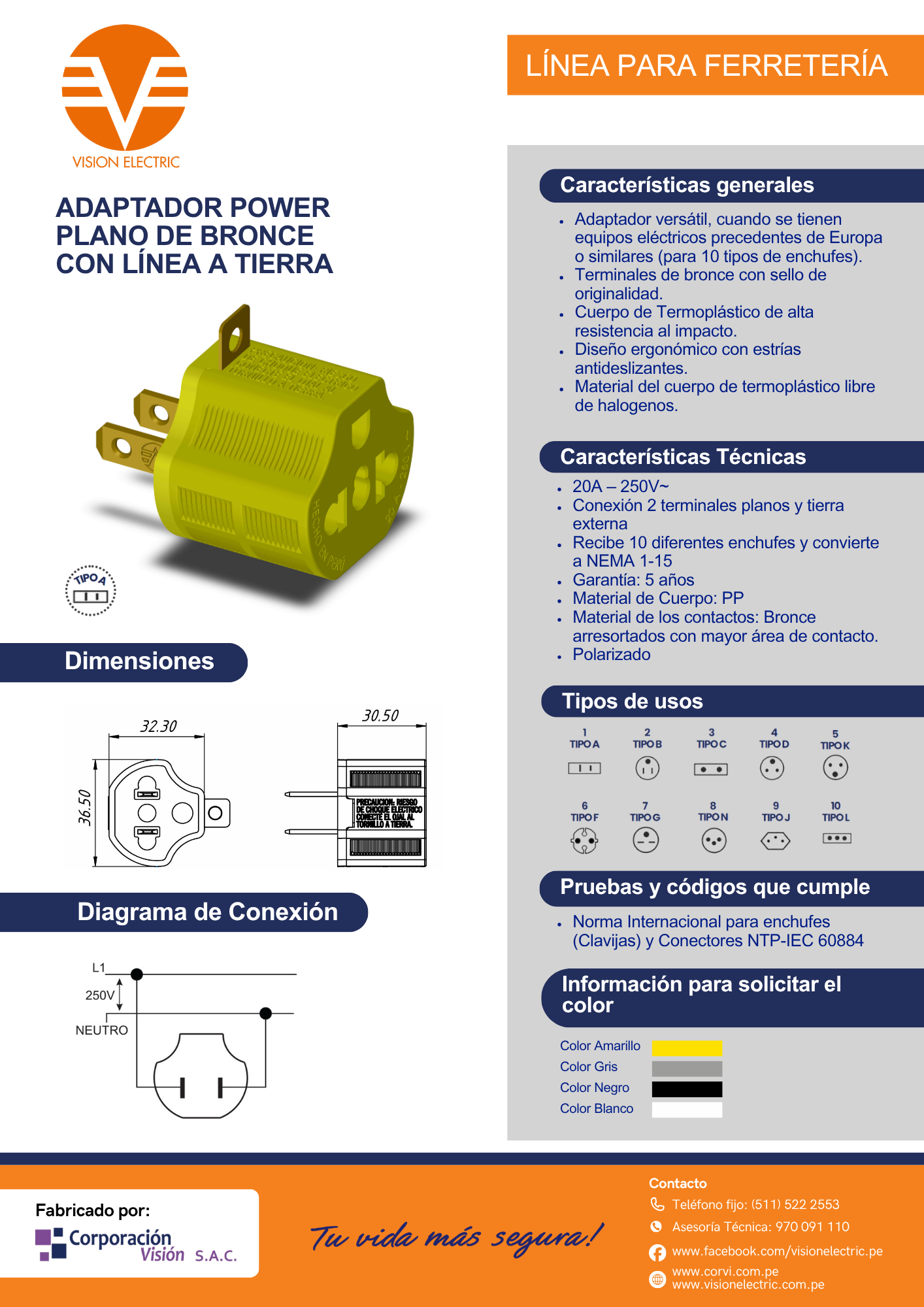 Línea de Tomacorrientes y Adaptadores Universales con terminales de bronces 7 opcines diferentes para conectar, uso en viviendas equipos semi-industriales y profesionales de 20A 2250v~ (NORMA NTP-IEC 60884-1 : 2013)