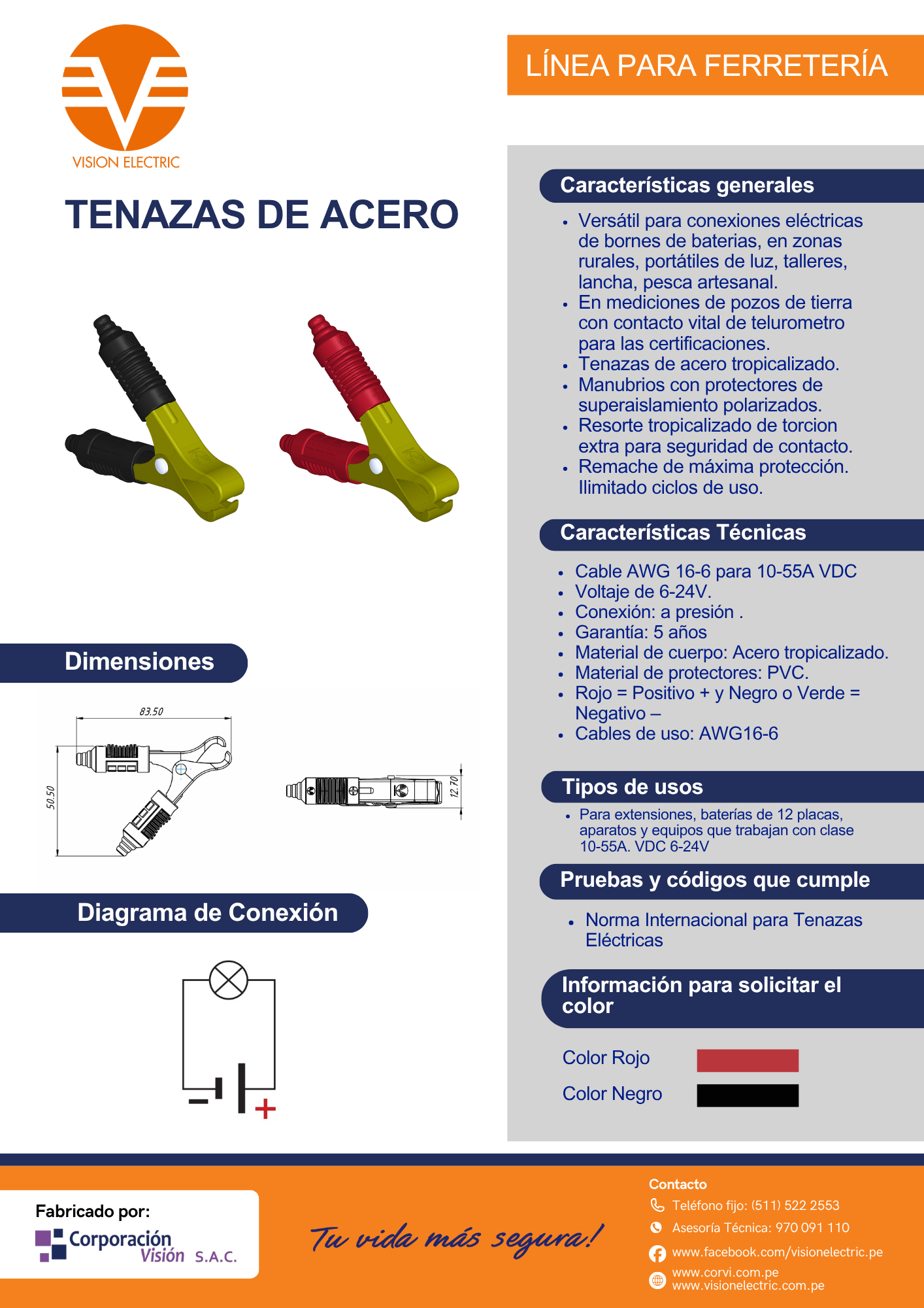 Línea de tenazas normalizadas de acero zincadas tropicalizadas y niqueladas de 50A 12VDC para uso de extensión de arranque de baterías de autos, cargadores de baterías, electrodomésticos hasta 12VDC instrumentos de medición
