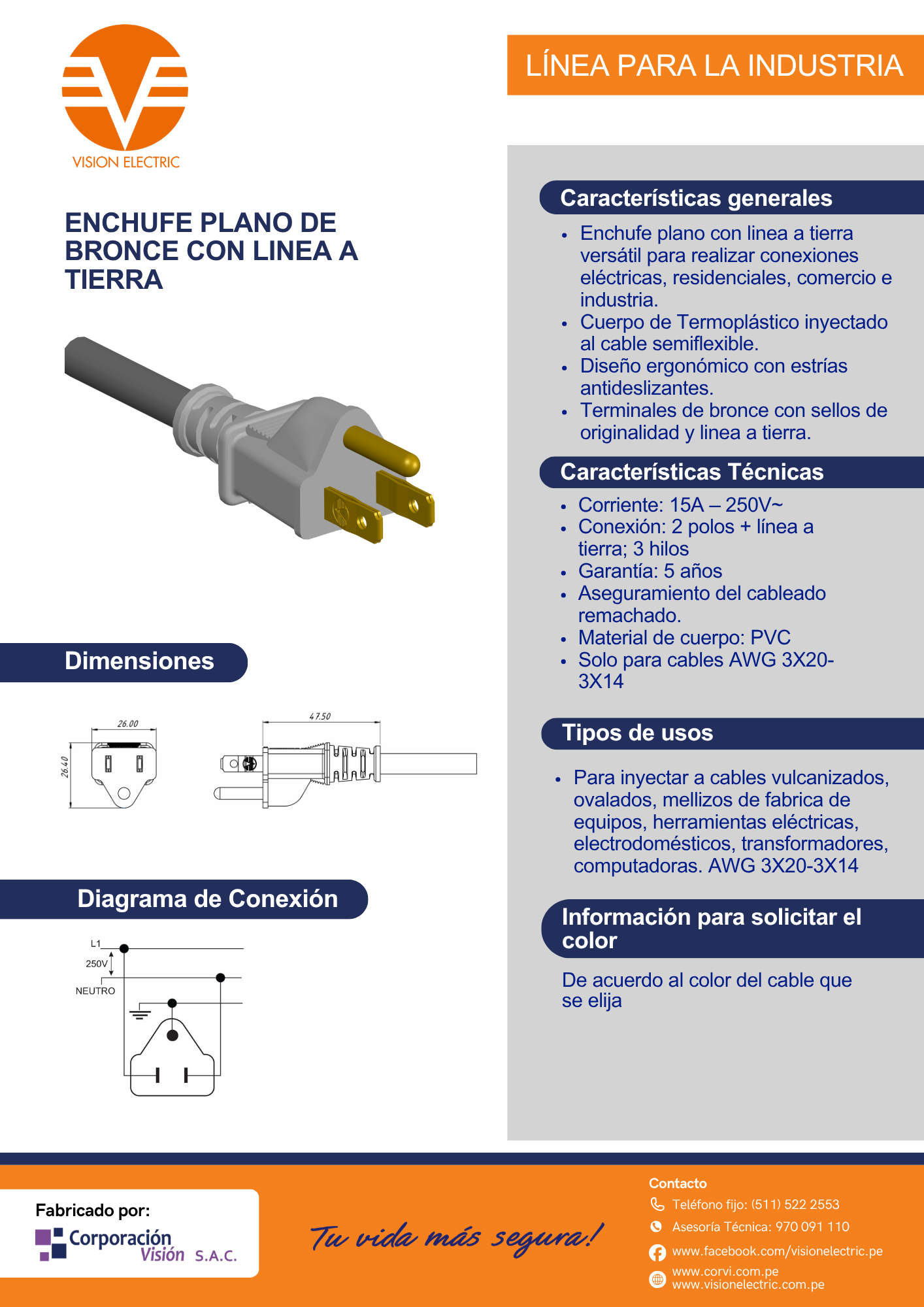 La Línea de enchufes industriales monofásicos con línea a tierra espiga plana (Norma ASA) y redondos (Norma DIN) para uso en viviendas, equipos industriales y profesionales 20A 250V~ (NORMA NTP-IEC 60884-1 : 2013)
