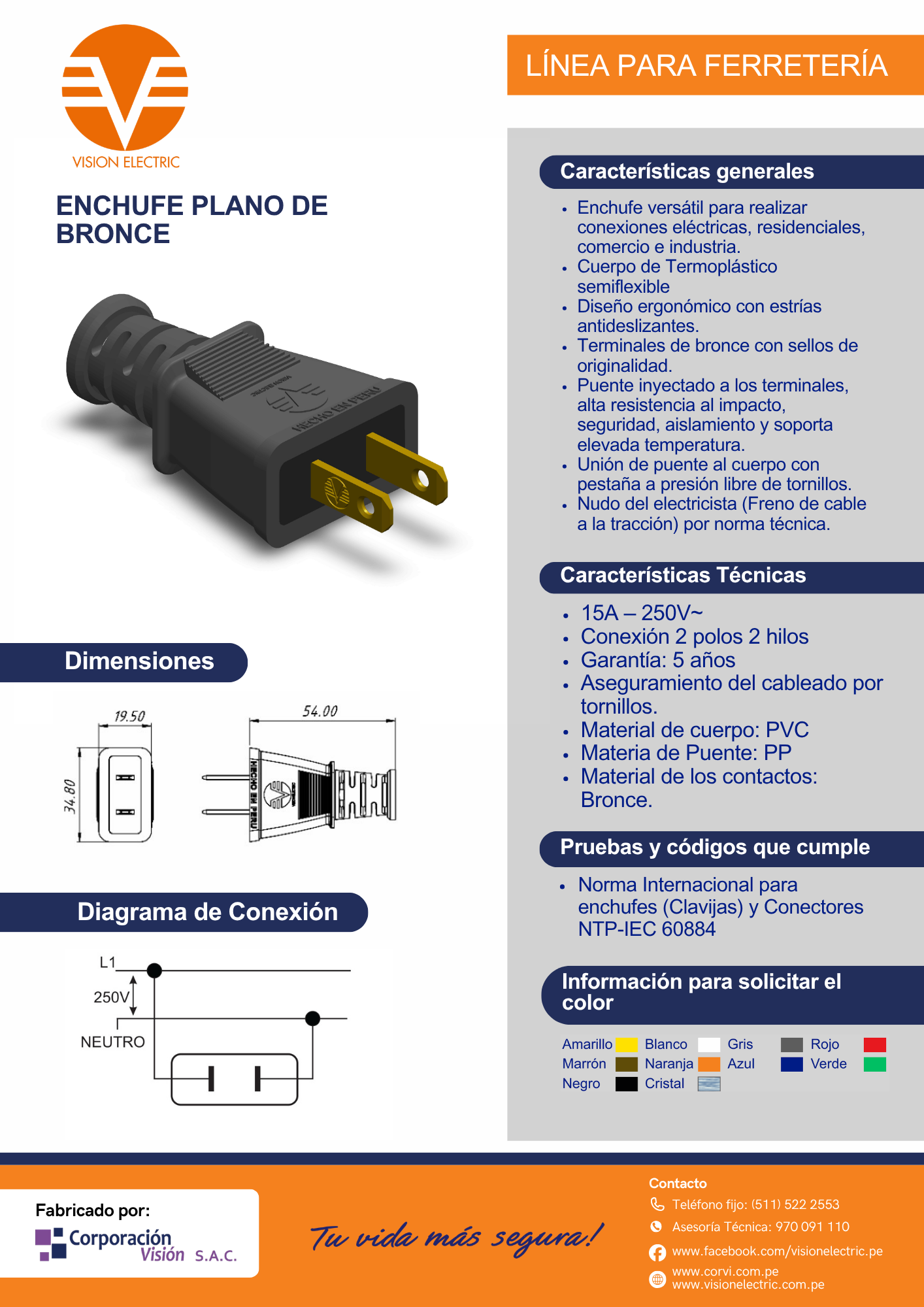 Línea de enchufes espiga plana de acero tropical izado y bronce, norma asa y redondos normas Din(de bronce) monofásicos sin línea a tierra, para uso de viviendas y semi-industriales 15A 250V~ (NORMA NTP-IEC 60884-1 : 2013)